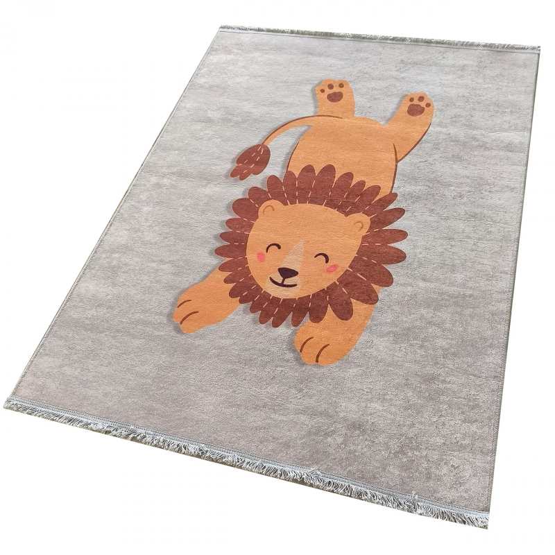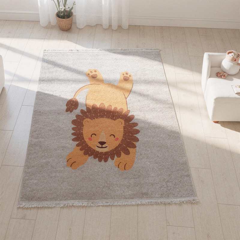 Dywan dziecięcy z motywem lwa w eleganckim beżowym kolorze to stylowy i praktyczny dodatek do dziecięcego pokoju. Wykonany z połączenia poliestru i gumowego spodu, jest lekki, cienki (5 mm) i przyjemny w użytkowaniu. Antypoślizgowy, gumowy spód zapewnia stabilność, a możliwość prania w pralce w 30°C ułatwia utrzymanie czystości. Idealny wybór do nowoczesnych i klasycznych pokoi dziecięcych.
