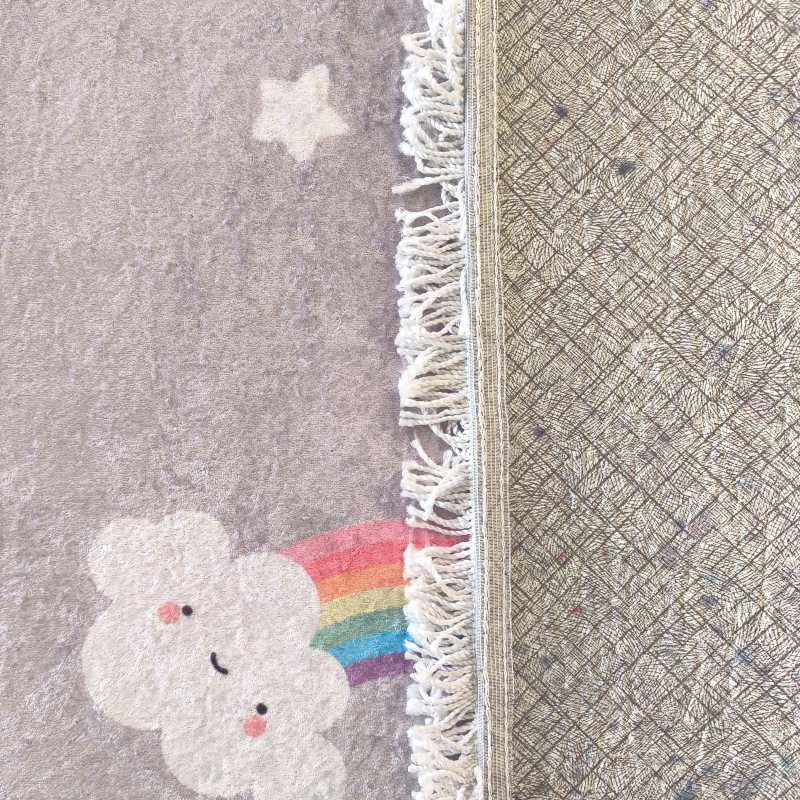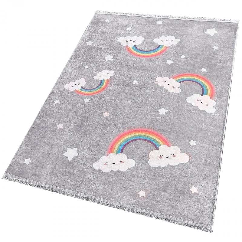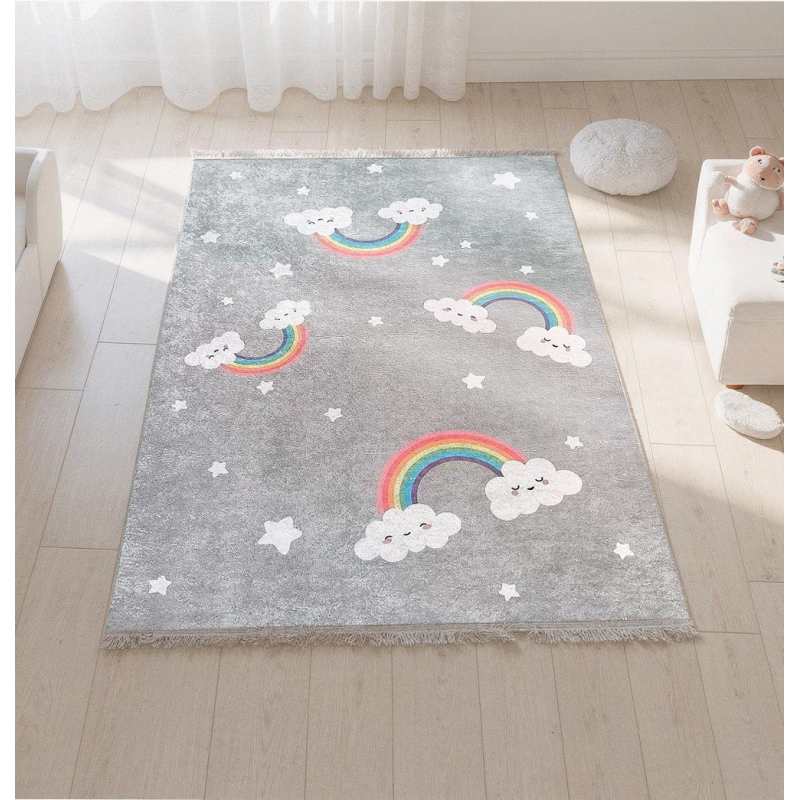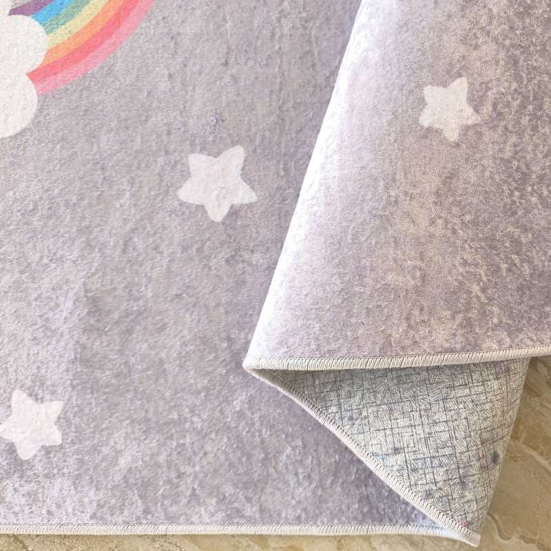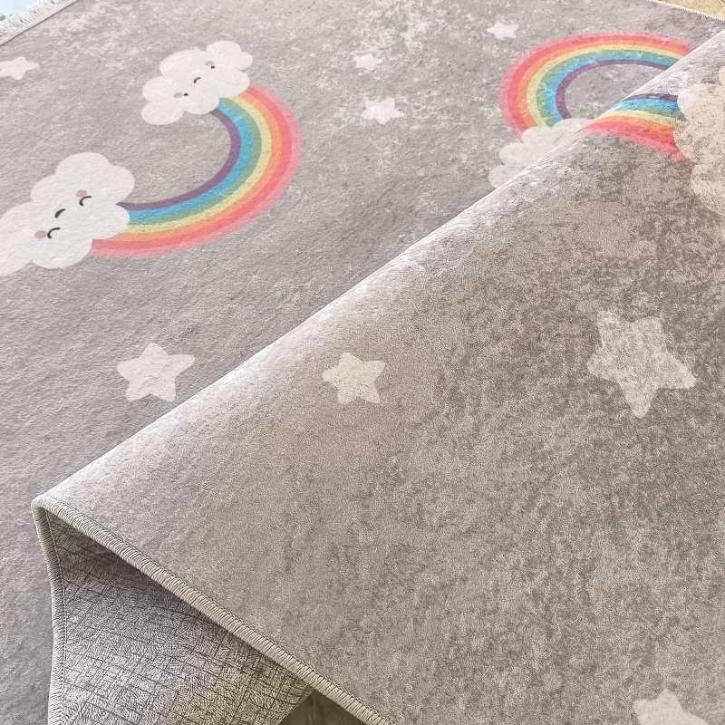 Dywan dziecięcy w eleganckim szarym kolorze ze wzorem tęczy to stylowy i praktyczny dodatek do dziecięcego pokoju. Wykonany z połączenia poliestru i gumowego spodu, jest lekki, cienki (5 mm) i przyjemny w użytkowaniu. Antypoślizgowy, gumowy spód zapewnia stabilność, a możliwość prania w pralce w 30°C ułatwia utrzymanie czystości. Idealny wybór do nowoczesnych i klasycznych pokoi dziecięcych.