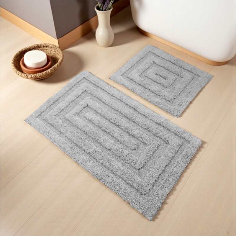 Dzięki szarym dywanikom łazienkowym, w prosty sposób wniesiesz odrobinę koloru i komfortu do łazienki. Zestaw z subtelnym wzorem wykonany z bawełny. Struktura dywanów potrafi wchłonąć wodę i utrzymać suchą podłogę w łazience.